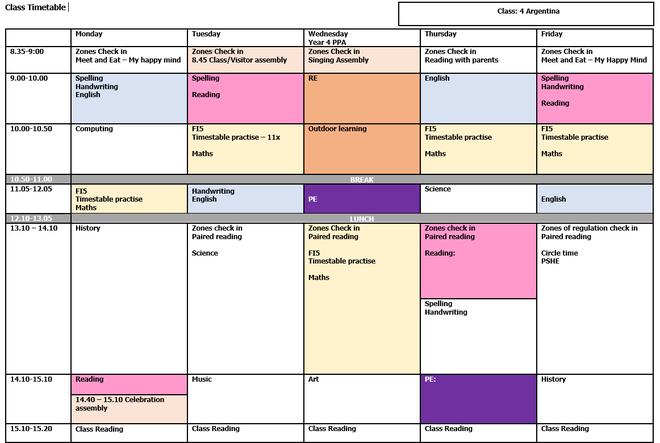 Please see below Argentina's weekly timetable for Summer 1. This may be subject to change however, PE days will stay the same. PE days will be on Wednesdays and Thursdays. On these days, children we need to be in their correct PE kit. Everyday, the children need to bring in their water bottles, planners and reading books. Please check your pupil planner every day for key messages. This also needs to be signed at home every week.