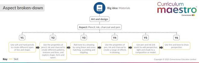Our art and design curriculum is high quality, well thought out and is planned to demonstrate progression. We define progress in art as children ‘knowing and being able to do more’. Our curriculum provides opportunities to see what knowledge children have retained and what skills they have mastered. For example, the chart below, from our curriculum, shows how children’s use of pencil, ink, charcoal and pen progresses over time to enable children to know and do more in this aspect of art and design.