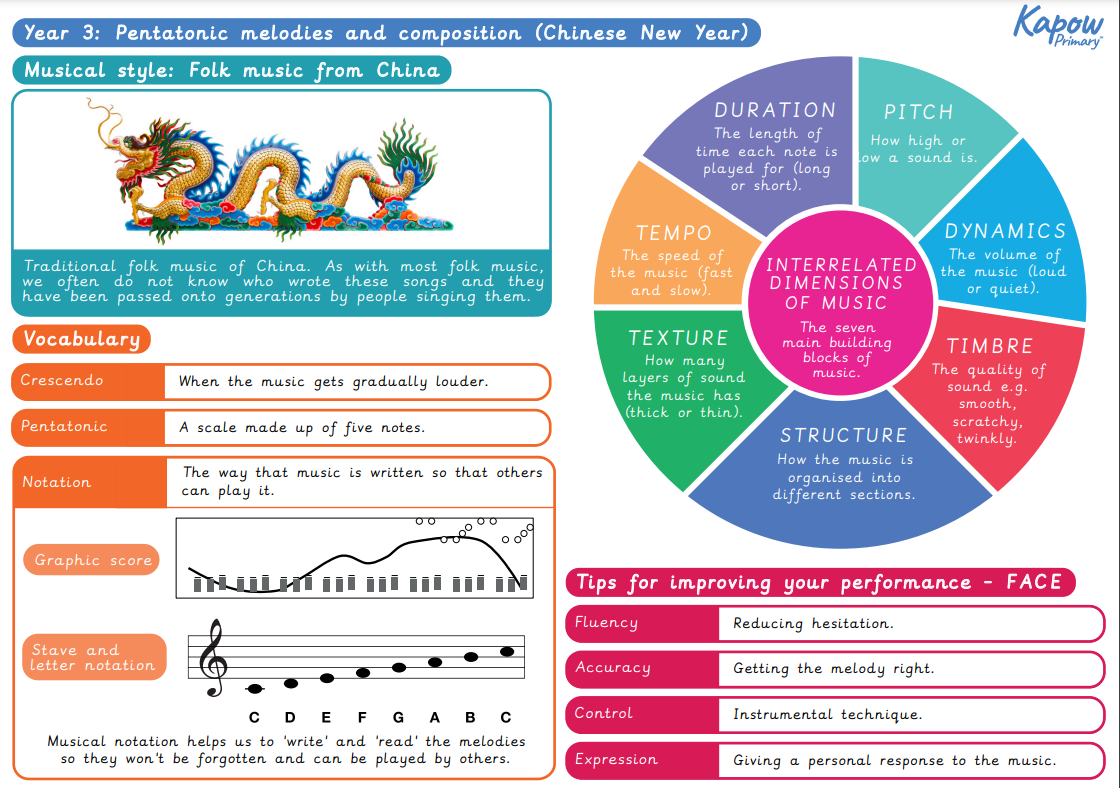 The impact of our music curriculum can be constantly monitored through both formative and summative assessment opportunities. Each lesson includes guidance to support teachers in assessing pupils against the learning objectives and at the end of each unit there is often a performance element where teachers can make a summative assessment of pupils’ learning. Knowledge organisers for each unit support pupils by providing a highly visual record of the key learning from the unit, encouraging recall of practical skills, key knowledge and vocabulary.