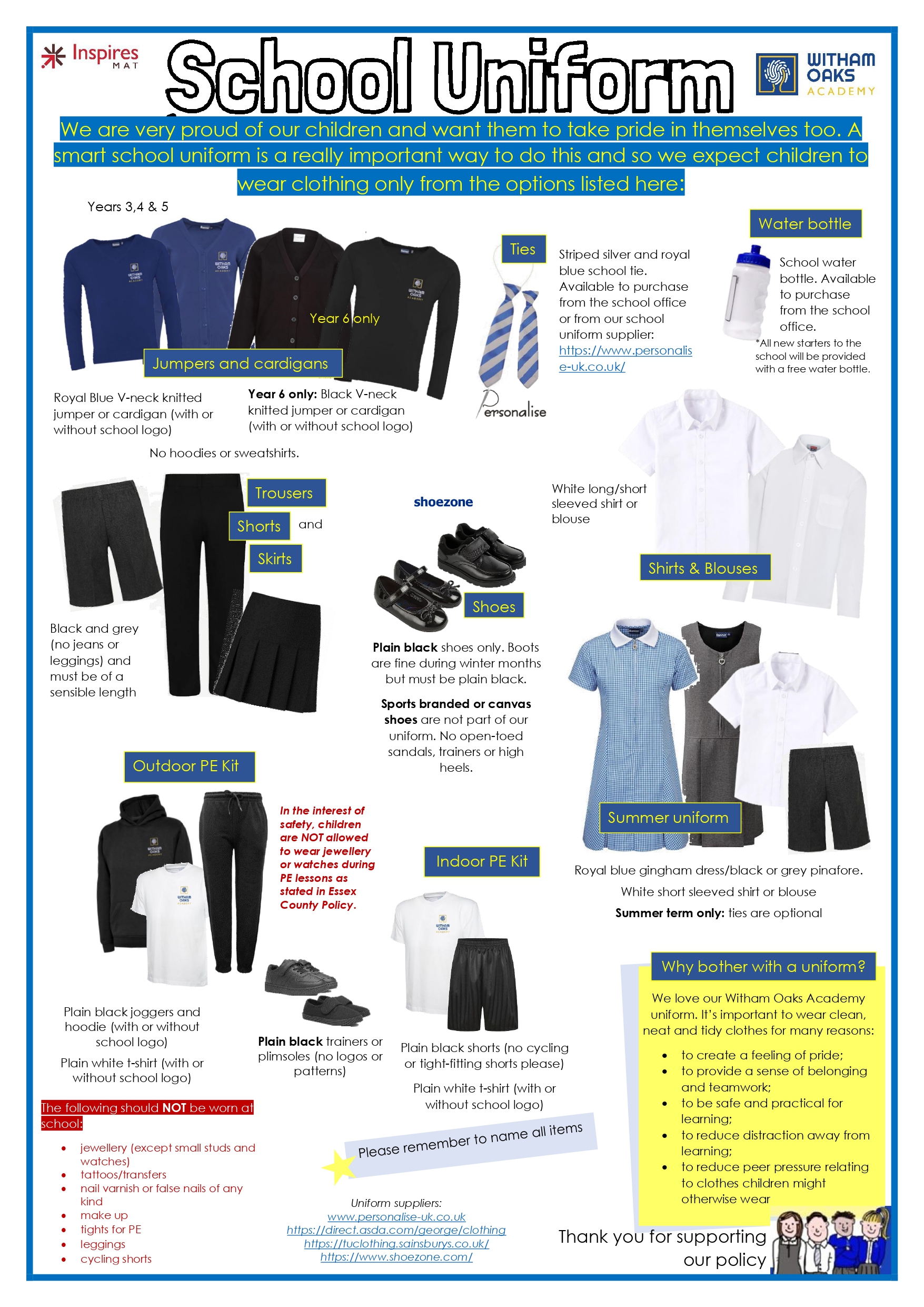 The school colours at Witham Oaks Academy are Royal blue, white, mid to dark grey and black. Only plain black trainers or shoes are acceptable.